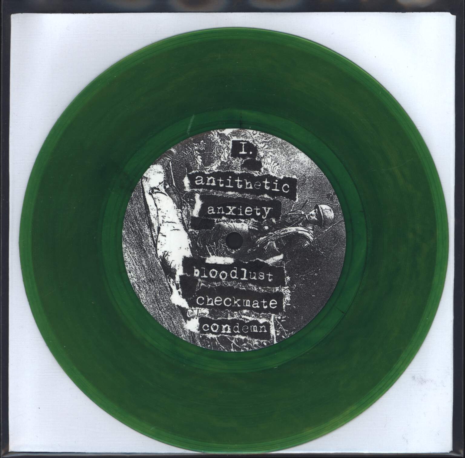 300 made; green translucent; comes with a single sided printed black and white lyrics/photo sheet