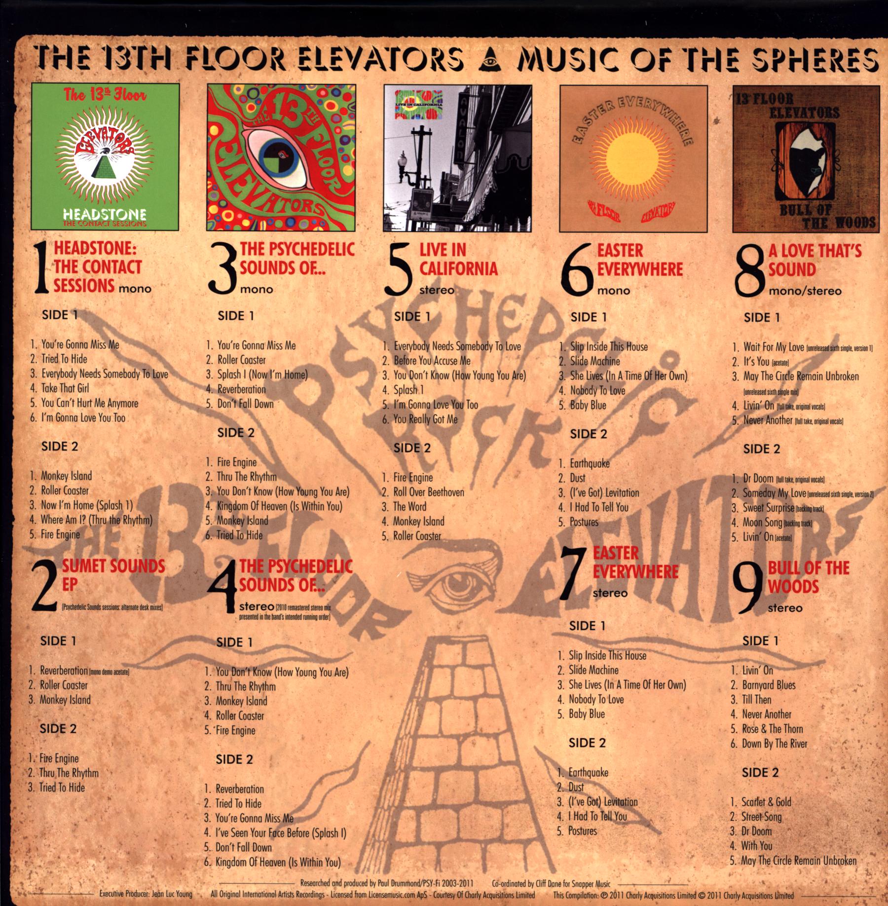 Limited hand-numbered edition of 3000 copies. 8 LPs plus 1 10" record, including mono and stereo versions of the classic albums plus lots of bonus material: unreleased tracks, alternate mixes, live recordings, ... Issued in a card box with lenticular cover inset. Contains the 44-page 12"x12" book "Sign of the Three Eyed Men" (2011 Revised Edition); 8" 3D lenticular prints of the album artwork for 'The Psychedelic Sounds Of...,' 'Bull Of The Woods' and 'Easter Everywhere,' plus a hand-numbered reproduction packing slip.
