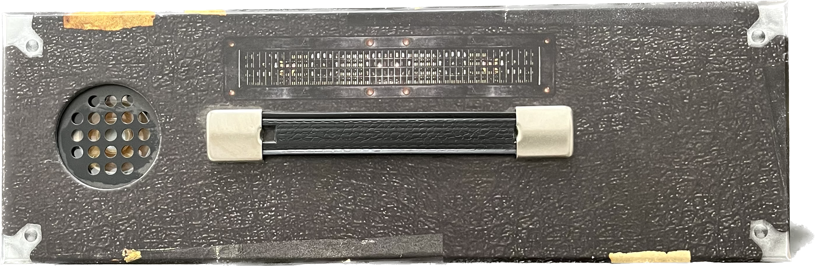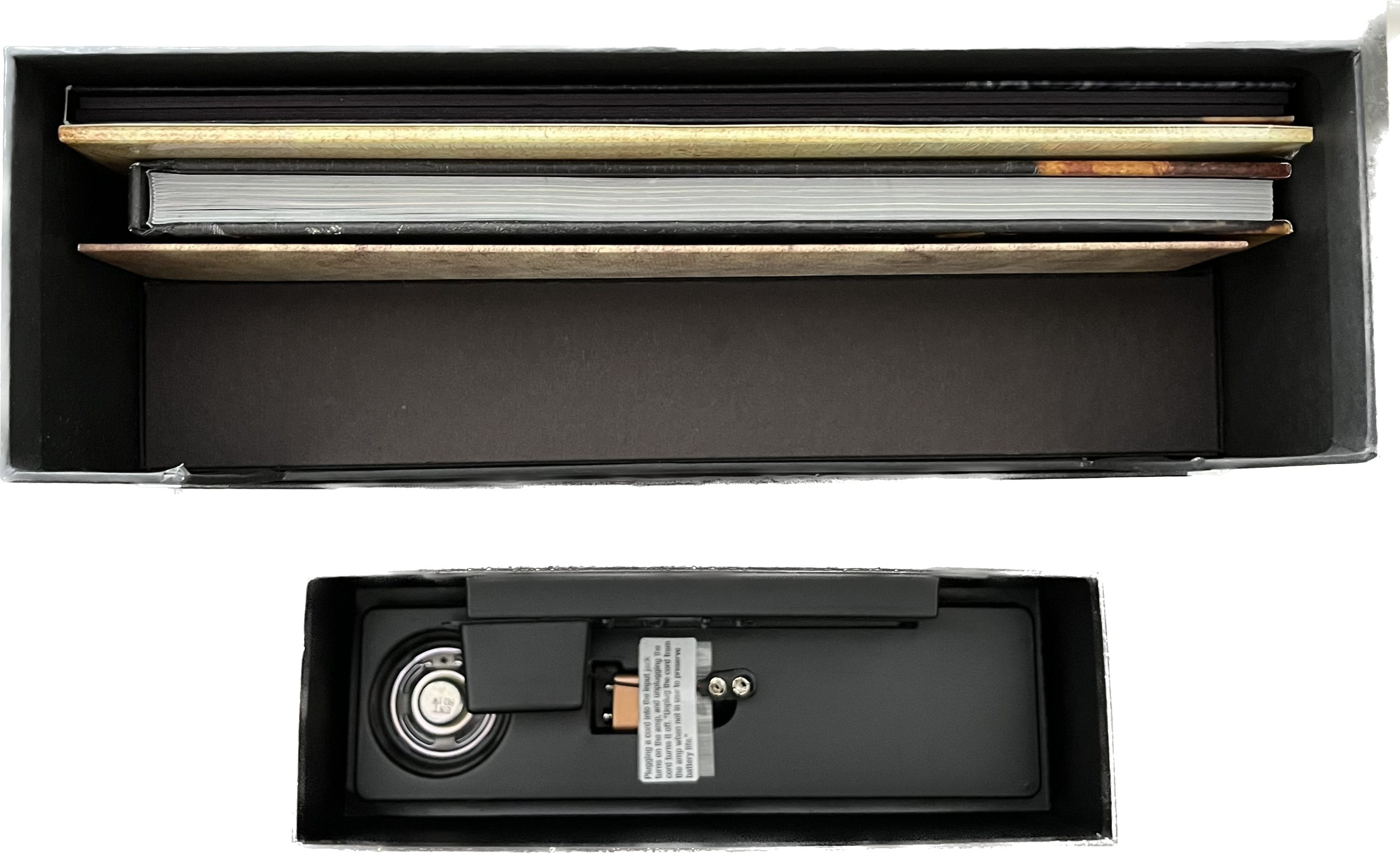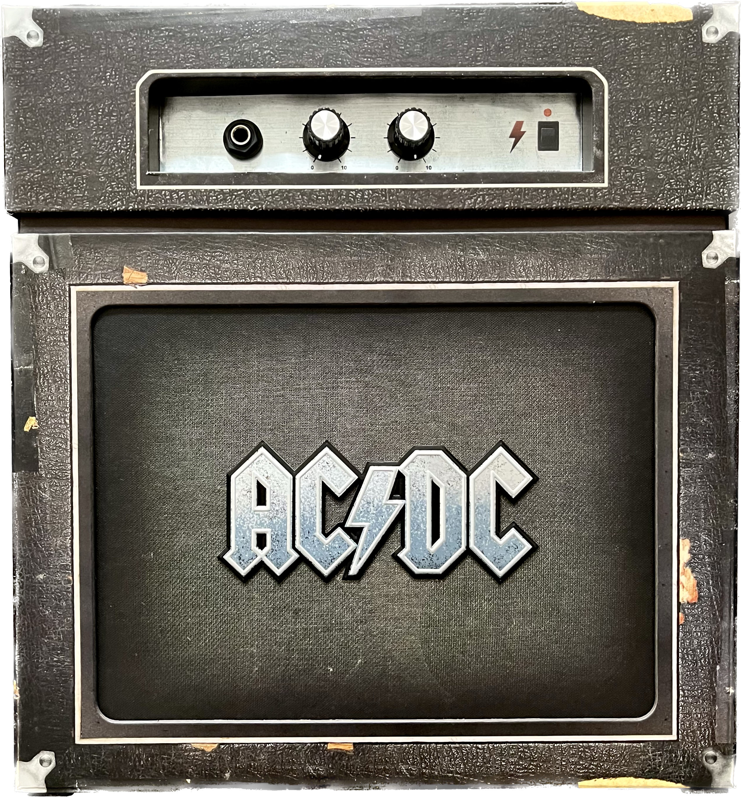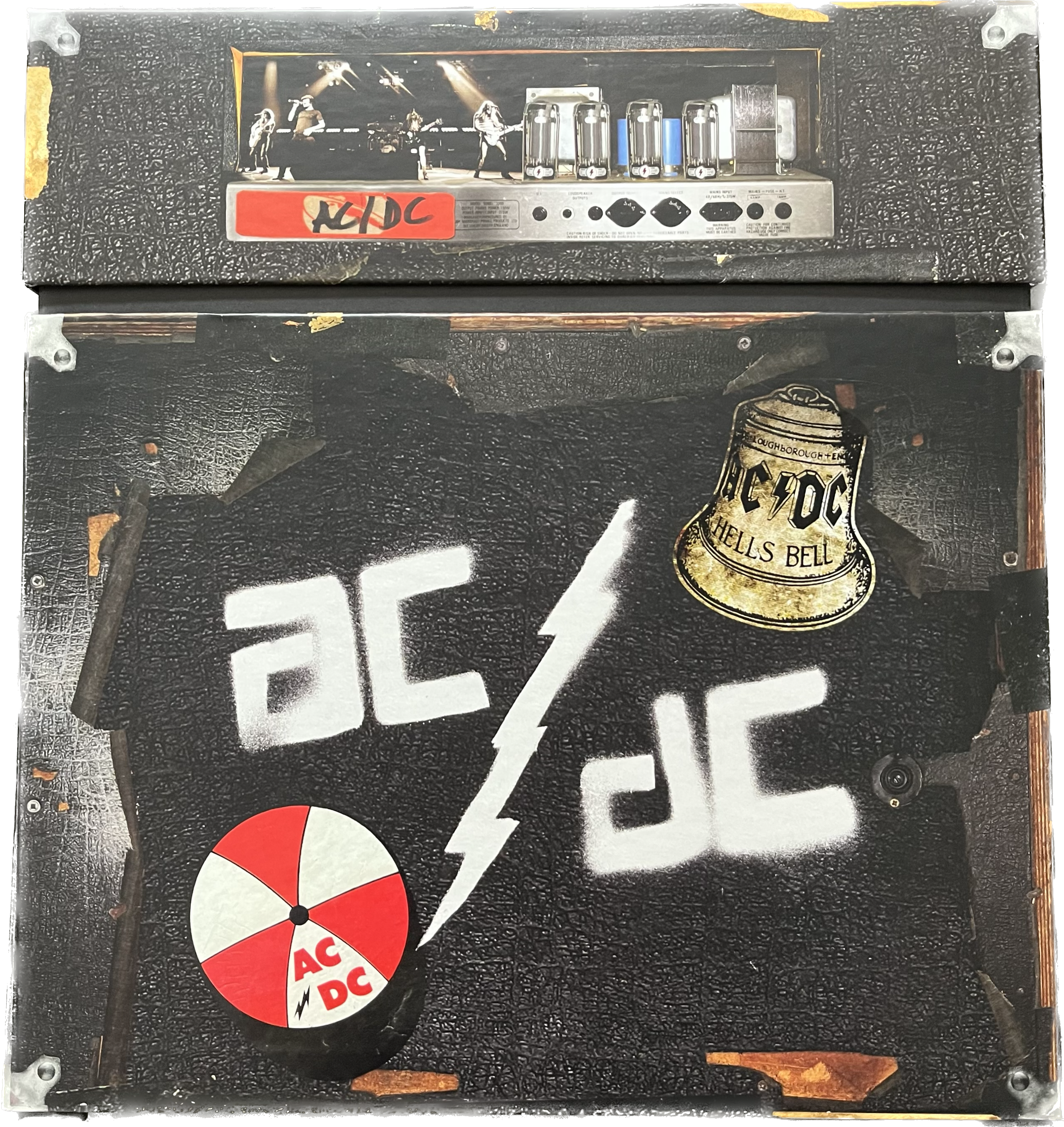Guitar amplifier The 12"x12"x4" (30cm*30cm*10cm) exterior box is designed to resemble a vintage AC/DC guitar amplifier and also has the original logo that was spray-painted onto the rear of Angus and Malcolm Young's speaker cabinets in 1975. The “head” of the amp has a handle that lifts the top off to reveal the contents housed within. The head is also a working guitar amplifier. It is a one watt amplifier. 164-Page booklet Original memorabilia reproductions: "I Do it For AC/DC" 2"inch button, a sticker, a "Lock Up Your Daughters" Tour Flyer, King Street Studio Track Sheet for "Dirty Deeds Done Dirt Cheap" Multitracks, a Bon Scott Temporary Tattoo, "Moneytalks" Bill, AC/DC Guitar Pick, set of Three 20cm by 25cm art lithographs and a 60cm by 90cm, 1977 "Let There Be Rock" European Tour Poster.