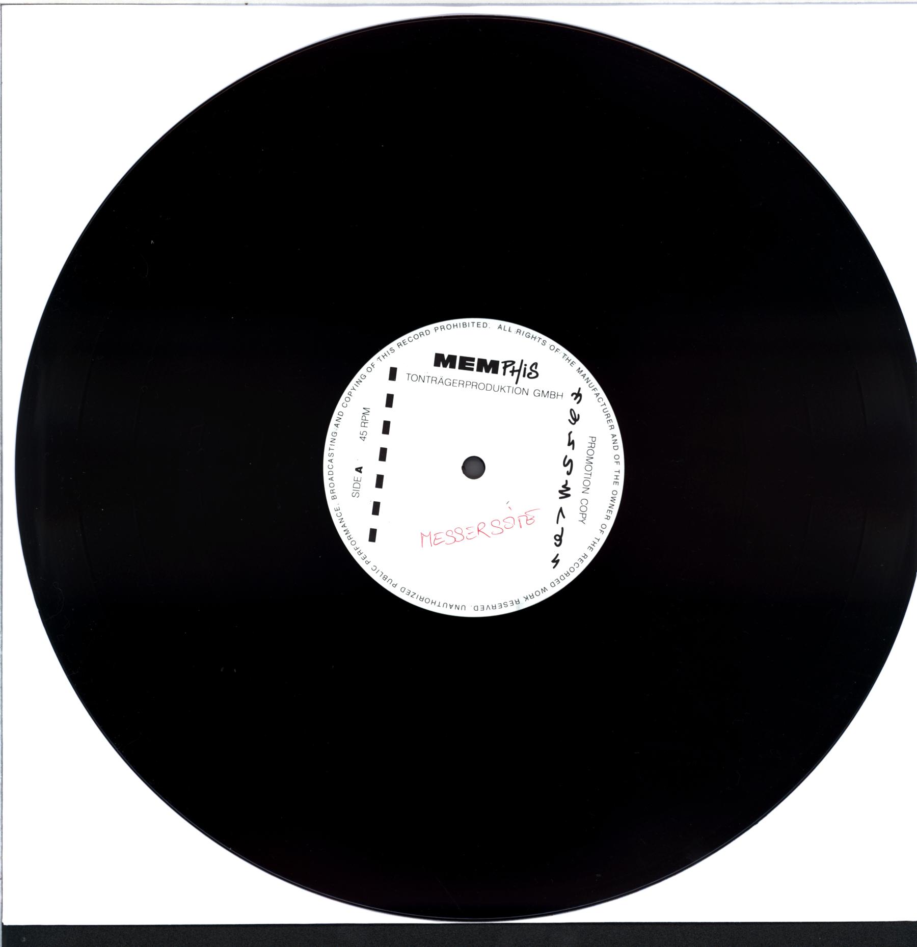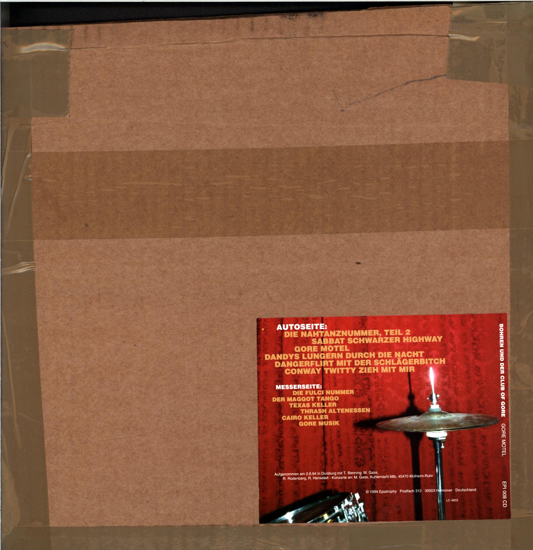 Originally scheduled to be released on vinyl in 1995, approx. 10 test pressings of Gore Motel were made. As a result of production issues with the outer box, the release was delayed. Memphis Tonträgerproduktion GmbH went bankrupt in 1996, resulting in the loss of the original DMM lacquers meant to be used for the vinyl edition. Commercial vinyl editions of these lacquers were never produced. It took ten years for the label to release the album on vinyl with newly cut lacquers in 2005. This copy comes from someone involved in the production of the original cover/box. Handwritten side names on labels. Handmade cardboard sleeve with 1995 CD artwork glued to it.