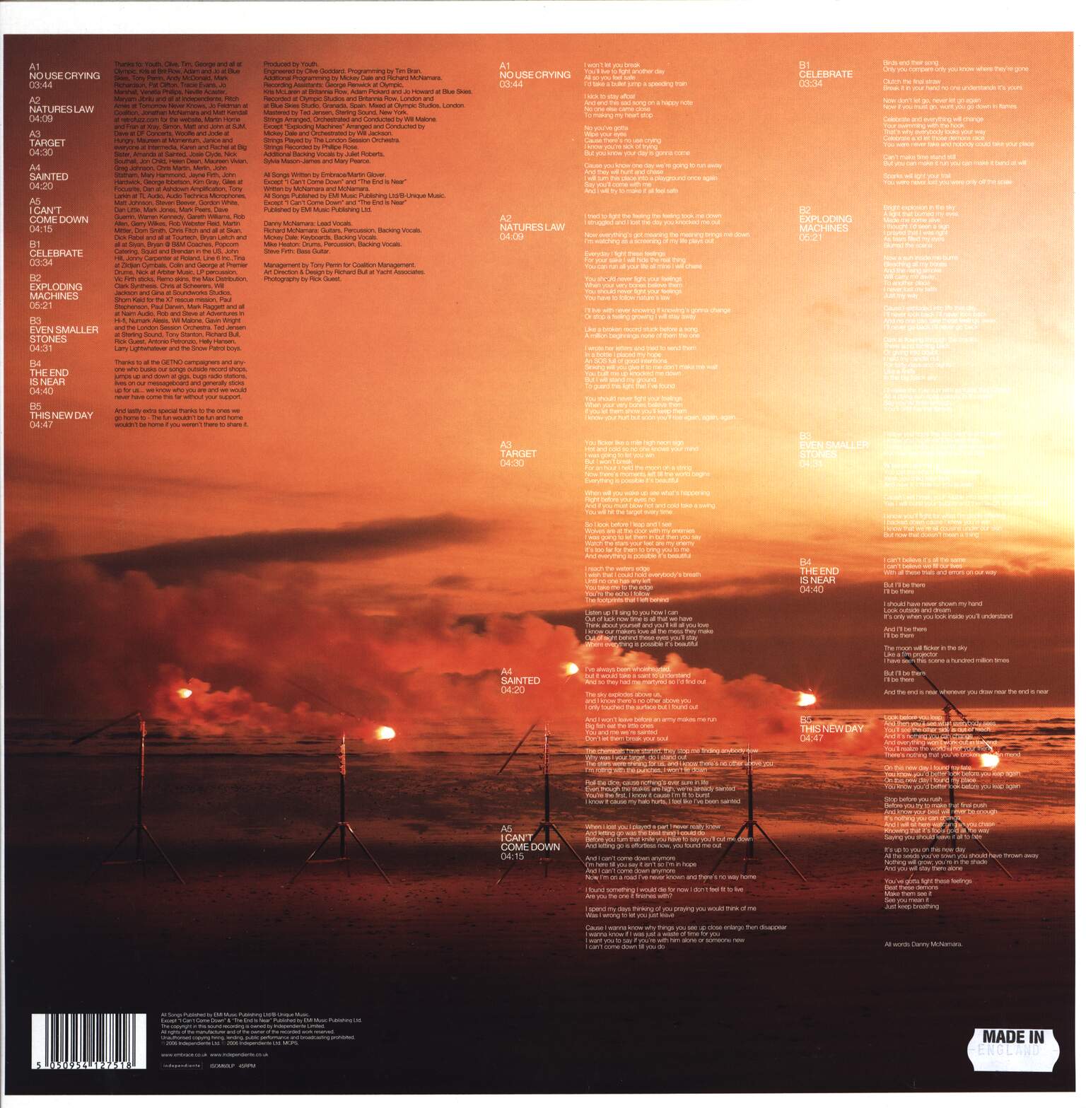 Written-By – McNamara* (tracks: A5, B4), Embrace (tracks: A1 to A4, B1 to B3, B5), Martin Glover (tracks: A1 to A4, B1 to B3, B5), McNamara* (tracks: A5, B4)