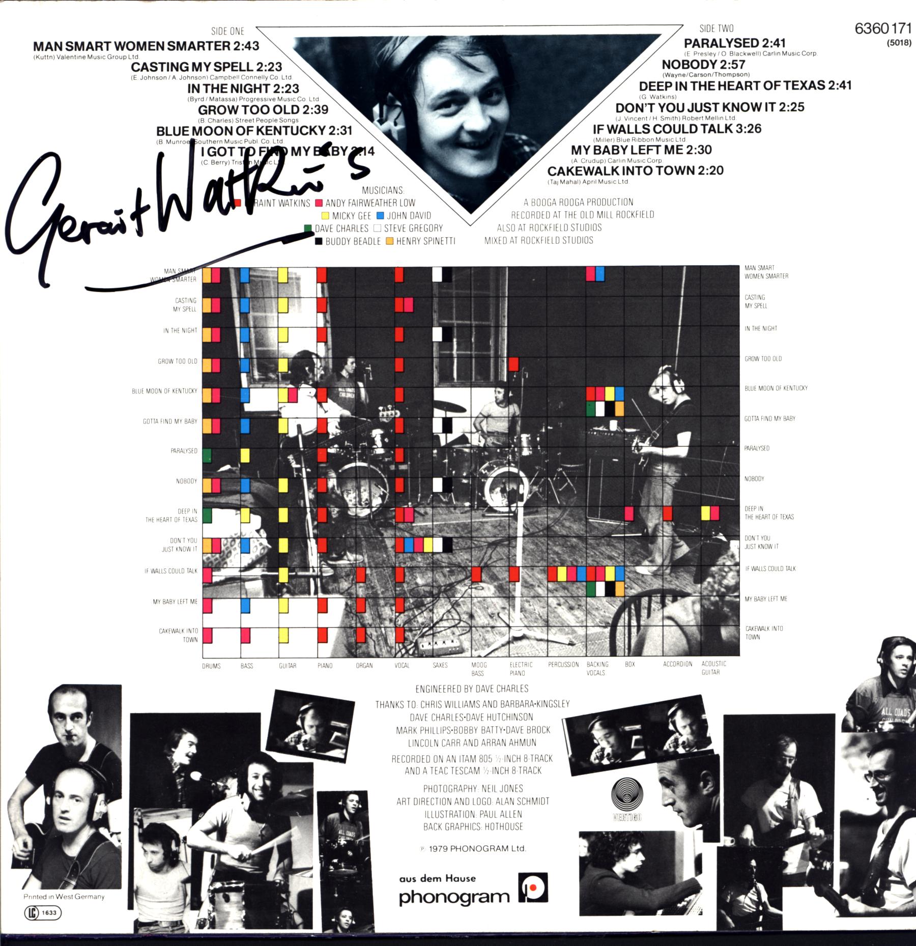 Signed on back sleeve by Geraint Watkins (Willy and the Poor Boys, Graham Parker & The Goldtops, Nick Lowe & His Band, Dave Edmunds Band, Shakin Stevens, ...).