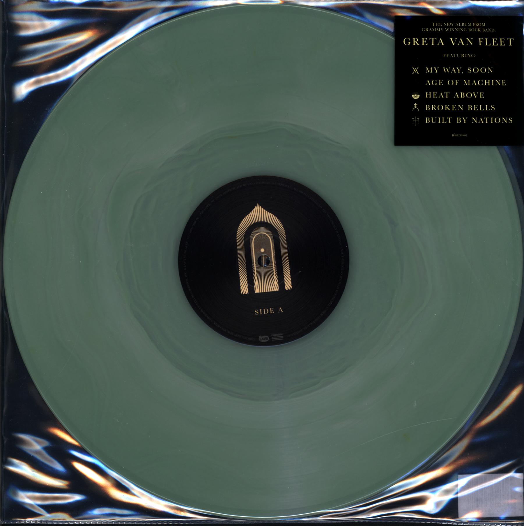 green vinyl in stickered transparent plastic gatefold sleeve