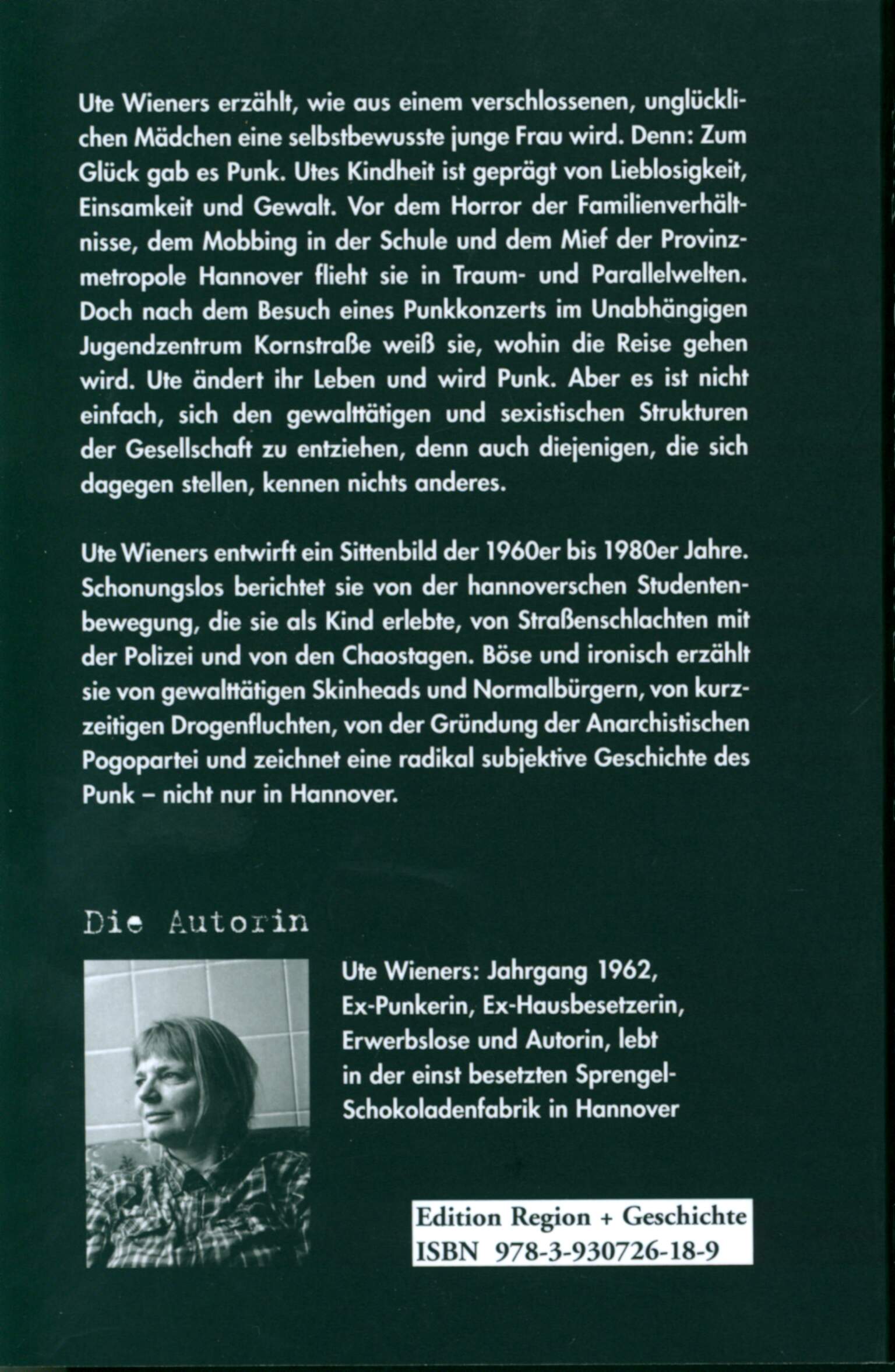 Ute Wieners erzählt, wie aus einem verschlossenen, unglücklichen Mädchen eine selbstbewusste junge Frau wird. Denn: Zum Glück gab es Punk. Utes Kindheit ist geprägt von Lieblosigkeit, Einsamkeit und Gewalt. Vor dem Horror der Familienverhältnisse, dem Mobbing in der Schule und dem Mief der Provinzmetropole Hannover flieht sie in Traum- und Parallelwelten. Doch nach dem Besuch eines Punkkonzerts im Unabhängigen Jugendzentrum Kornstraße weiß sie, wohin die Reise gehen wird. Ute ändert ihr Leben und wird Punk. Aber es ist nicht einfach, sich den gewalttätigen und sexistischen Strukturen der Gesellschaft zu entziehen, denn auch diejenigen, die sich dagegen stellen, kennen nichts anderes. Ute Wieners entwirft ein Sittenbild der 1960er bis 1980er Jahre. Schonungslos berichtet sie von der hannoverschen Studentenbewegung, die sie als Kind erlebte, von Straßenschlachten mit der Polizei und von den Chaostagen. Böse und ironisch erzählt sie von gewalttätigen Skinheads und Normalbürgern, von kurzzeitigen Drogenfluchten, von der Gründung der Anarchistischen Pogopartei und zeichnet eine radikal subjektive Geschichte des Punk – nicht nur in Hannover. Die Autorin: Ute Wieners, Jahrgang 1962, Ex-Punkerin, Ex-Hausbesetzerin, Erwerbslose und Autorin, lebt in der einst besetzten Sprengel-Schokoladenfabrik in Hannover